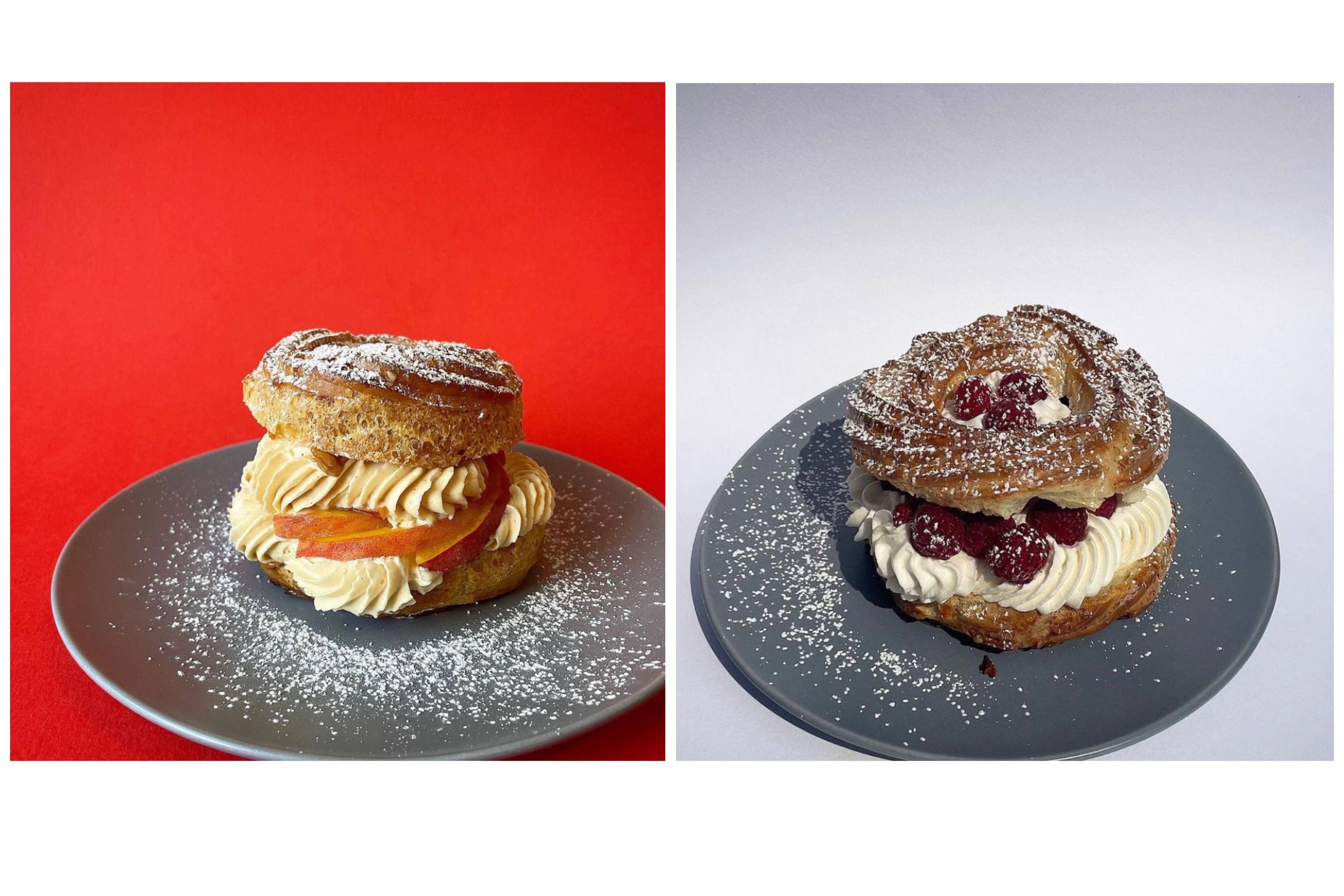 The seasonal Paris-Brest at Annette comes in flavors such as peach and dulce de leche cream (left) and raspberry and lemon mascarpone cream (right). (Provided by Annette)